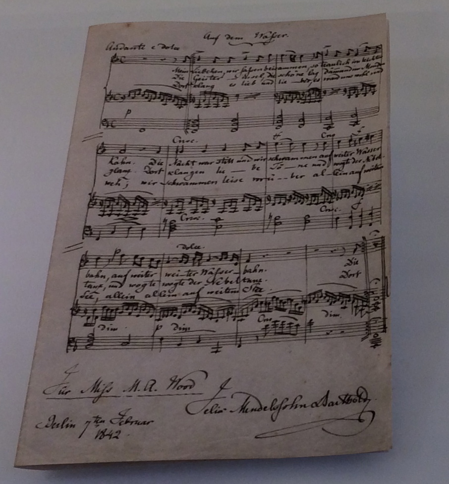 His music sketches and manuscript are just gorgeous. He clearly spent time perfecting a complex and ornate signature that is just beautiful. On display is a brief musical canon he sketched in London in 1844. The clue is that the scripted “F” in “Felix” arcs all the way up to where the second voice should enter.